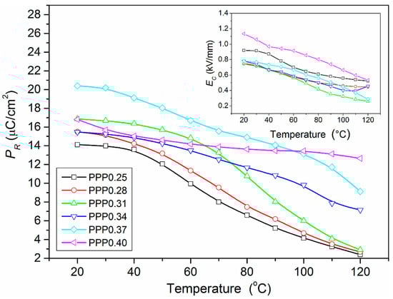 The temperature dependencies of remnant polarization PR and coercive filed EC (inside) for PMN–PT–PS solid solutions.