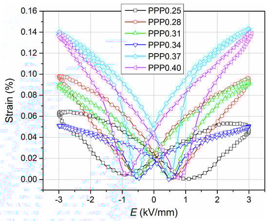 In an ideal defect-free single crystal material that is poled perfectly, the remnant strain is represented by its lattice distortion [26]. As is well known, the electric field induces strain in the ceramic sample, which is caused by the domain switching, the number of polarization states, electrostriction, and the applied electric field [27]. Figure 11 shows the results of electromechanical investigations (S-E) at room temperature for all of the unpolarized investigated ceramics using a frequency of 1 Hz. The PMN–PT–PS ceramic samples exhibit an appreciable S-E behavior. The change in the character of strain mechanism may be seen with increasing titanium content. In the samples with high titanium content, the strain versus the electric field is typical for piezoelectric materials (linear S-E dependency). The values of the remnant strain are 0.020%, 0.024%, 0.021%, 0.017%, 0.049%, and 0.042% for the PPP0.25, PPP0.28, PPP0.31, PPP0.34, PPP0.37, and PPP0.40 samples, respectively. Higher values of the remnant strain occur for the tetragonal phase compositions, which is characteristic of materials with a perovskite structure. In the case of the PPP0.34 sample, both the shape of the loop and the value of the remnant strain differ significantly from the other samples. This can be attributed to the accumulation of various reasons, such as the randomness of grain orientations that naturally confine the orientation of domains, depolarization fields arising from defects, pinning of domains, etc. [26].
