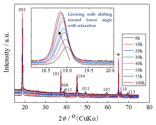 X-ray diffraction patterns of Li0.12Ni0.874Co0.090Al0.036O2 obtained during relaxation time after the termination of lithium extraction. Diffraction patterns measured after relaxation up to 100 h are superimposed on each plot. Asterisk marks (*) indicate the diffraction peaks of aluminum foil current collector. Diffraction profiles around 003 reflections are enlarged in the inset.