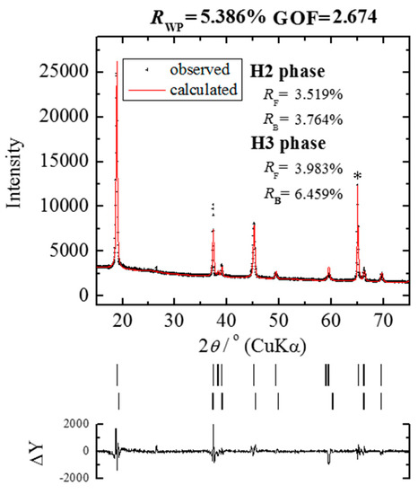 The sample was set in a sealed holder (Rigaku Corp., Ltd., Tokyo, Japan) with beryllium window in an argon-filled glove box and mounted on a XRD diffractometer (Ultima-lV, Rigaku Corp., Ltd.). XRD experiments were carried out from 15° to 75° in 2θ at a rate of 2°·min−1 with 0.04° step width by using CuKα radiation. The X-ray tube voltage and current were set to 40 kV and 40 mA, respectively. The six continuously collected XRD data sets were merged to improve the S/N ratio for the Rietveld refinement.