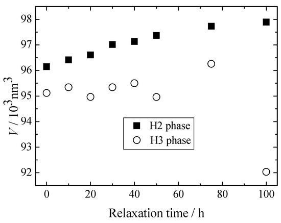 Changes in unit cell volume of Li0.12Ni0.874Co0.090Al0.036O2 with relaxation time. Closed and open symbols indicate the H2 and H3 phase, respectively.