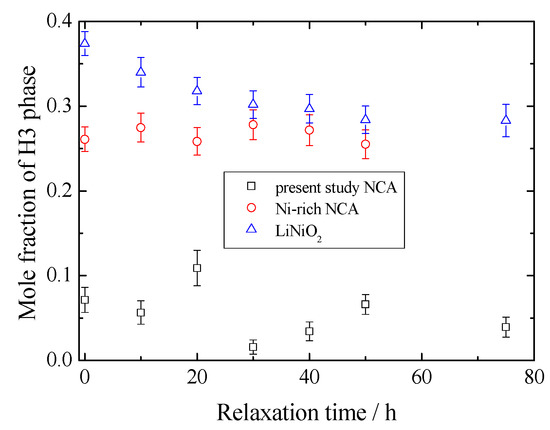 Therefore, it is thought that H3 forms from the H2 phase containing still larger lithium ions during charging, after that at the relaxation process lithium migration occurs to achieve a stable condition. Figure 6 shows changes in volume of the unit cell with the relaxation time. The volumes of H2 and H3 phases show the same trend as c-length. Figure 7 compares the mole fractions of H3 phases for LiNiO2, Ni-rich NCA and present NCA. It can be seen that mole fraction of the H3 phase reduces with the cobalt content, i.e., a larger cobalt introduction stabilizes the H2 phase.