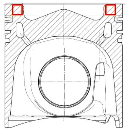 Illustration of the cross-section of a piston with the location of sample extraction at the bowl rim area indicated with red squares.