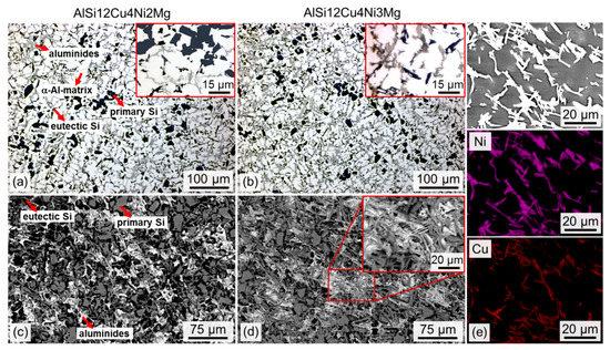 (a,b) light optical micrographs; (c,d) scanning electron microscopy (SEM) micrograph of the networks formed by Si and intermetallics after deep etching the α-Al matrix for AlSi12Cu4Ni2Mg (a,c) and AlSi12Cu4Ni3Mg (b,d); (e) SEM and energy-dispersive X-ray spectroscopy (EDX) maps of Ni and Cu for the AlSi12Cu4Ni3Mg alloy.