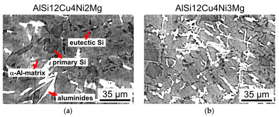 Figure 2a,b shows the 2D microstructure of the investigated alloys. Both alloys show the presence of dendrites with eutectic/primary Si and intermetallic phases (aluminides) in the interdendritic region. Moreover, clusters of connected primary Si particles result in a rather heterogeneous distribution of this phase. There are also several intermetallic phases containing Si, Cu, Ni, Mg, Mn and Fe [20,28,29]. SEM micrographs of deep etched specimens reveal a large fraction of needle-like intermetallics in the 3 wt.% Ni alloy (see insert in Figure 2d). EDX mappings reveal that these phases correspond to Al-Cu-Ni-rich aluminides (Figure 2e), i.e., most probably δ-phase (Al3CuNi) according to the literature (e.g., [29,30]).