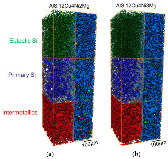 Figure 4 shows visualizations of the 3D networks formed by intermetallics and eutectic + primary Si in a volume of 420 × 400 × 1180 µm3. The left half of the visualization shows each segmented microstructural component separately: red = intermetallics, blue = primary Si particles, green = eutectic Si. On the other hand, the right halves of Figure 4a,b show all the rigid phases embedded in the transparent α-Al-matrix. Different colors have been assigned to each individual particle in this half of the volumes. While the aluminides (intermetallics) as well as primary + eutectic Si form globally highly interconnected 3D networks on their own (left half of each figure), all these phases together form a globally practically fully connected network in both alloys (right half of each figure) [1,16].