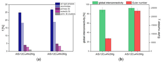 The volume fraction, f, global interconnectivity and Euler number, χ, of Si and aluminides before deformation determined in volumes of 420 × 400 × 1180 µm3 are shown in Figure 5a,b individually and combined, that is, for the hybrid 3D network shown in Figure 4. Both alloys possess similar volume fractions of rigid phases (see Figure 5a) and—from a global point of view—highly interconnected networks with global interconnectivities of about 95% (see Figure 5b, green bars). A considerable difference between the 3D hybrid networks of the two alloys is given by their local connectivity, quantified here using the topological parameter Euler number χ (Figure 5b, red bars). The lowest Euler number (−23,326 ± −1115) for the 3D network of AlSi12Cu4Ni3Mg indicates the highest local connectivity, that is, a larger number of connecting branches within the 3D network than for the alloy with 2 wt.% Ni, which shows about 41% less local connectivity (χ = −7277 ± −436).