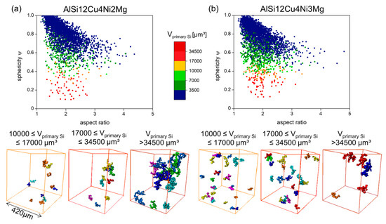 Sphericity-Aspect ratio-Volume diagrams for primary Si: (a) AlSi12Cu4Ni2Mg and (b) AlSi12Cu4Ni3Mg. The bottom of the figure shows representative 3D visualization of primary Si clusters for 10,000 µm3 ≤ Vprimary Si ≤ 17,000 µm3 (yellow), 17,000 µm3 ≤ Vprimary Si ≤ 34,500 µm3 (red) and Vprimary Si > 34,500 µm3 (brown).