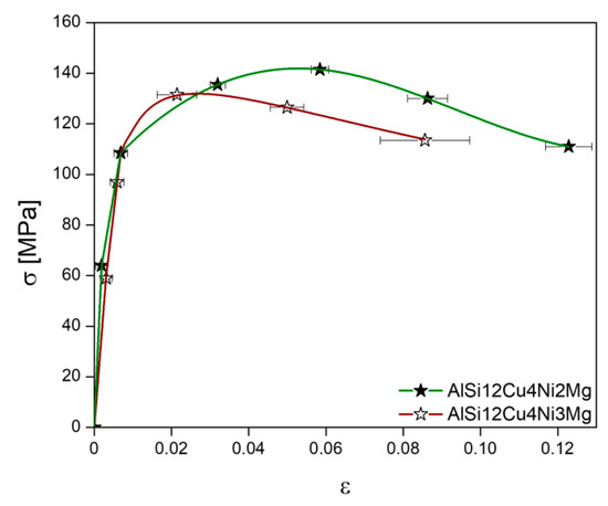 Table 3 presents average values for Brinell hardness of the alloys (HB) and nano-hardness of the α-Al matrix (H). Although the results are very similar considering the experimental scatter, the AlSi12Cu4Ni3Mg alloy may have a slightly higher Brinell hardness than AlSi12Cu4Ni2Mg.