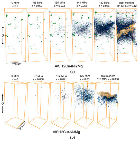 Figure 8a,b shows the damage (blue) at several deformation steps during tensile deformation at 300 °C as wells as in the post-mortem condition for the AlSi12Cu4Ni2Mg and AlSi12Cu4Ni3Mg alloys, respectively. The regions shown in yellow in the post-mortem conditions correspond to the fracture surface (the upper half of the fractured sample of the AlSi12Cu4Ni3Mg alloy could not be scanned and it is therefore missing in Figure 8b). It can also be seen qualitatively that AlSi12Cu4Ni2Mg shows a larger number and volume fraction of voids before final failure compared to AlSi12Cu4Ni3Mg, indicating that the alloy with less Ni is able to accommodate more damage before fracture. Damage forms and accumulates in a rather localized manner for both alloys. Moreover, AlSi12Cu4Ni2Mg shows the presence of randomly distributed processing porosity (see green particles in unloaded condition of this alloy in Figure 8a), which arises as a result of metal shrinkage during solidification. Damage was not observed to proceed from these shrinkage pores.