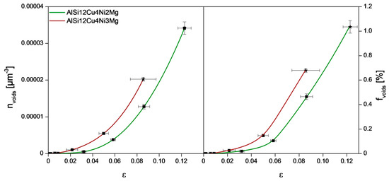 The accumulation of damage is shown quantitatively in Figure 9 considering the number density (nvoids) and volume fraction (fvoids) of voids as a function of strain. Here, no distinction is made between micro-cracks and rounder voids. AlSi12Cu4Ni2Mg displays less damage than AlSi12Cu4Ni3Mg at the same applied strain and accumulates a larger fraction of damage prior to final failure.