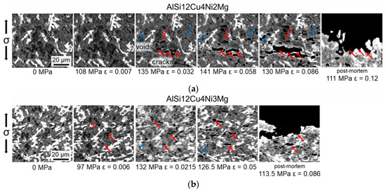Damage mechanisms observed during the in-situ tensile tests: (a) AlSi12Cu4Ni2Mg; (b) AlSi12Cu4Ni3Mg. The load direction is vertical.