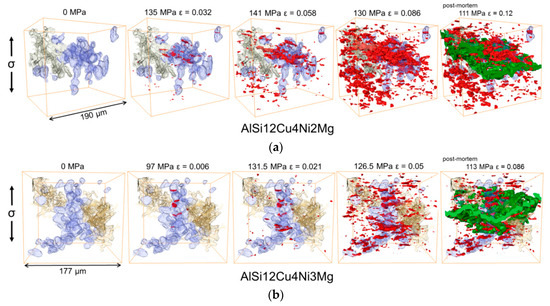 3D visualization of processing porosity (green), voids (blue) near the fracture surface (beige) at several load steps during the in-situ tensile tests at 300 °C: (a) AlSi12Cu4Ni2Mg; (b) AlSi12Cu4Ni3Mg. The load direction is vertical.