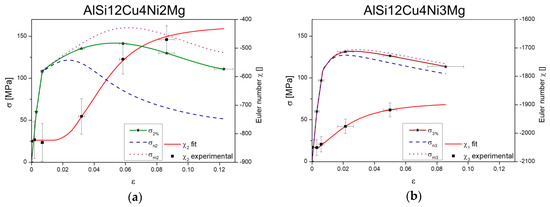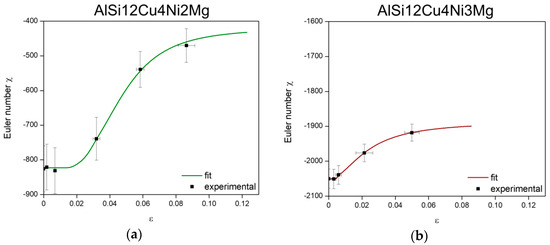 Evolution of Euler number of the 3D rigid network during tensile deformation for the volumes shown in Figure 11: (a) AlSi12Cu4Ni2Mg and (b) AlSi12Cu4Ni3Mg.