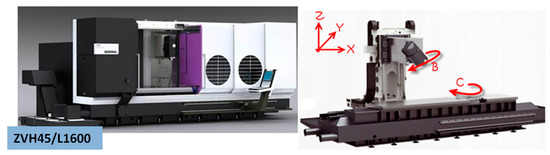 A multi-process machine ZVH38/L1600 (Figure 1) from Ibarmia (Azkoitia, Spain) was used for gear manufacturing. The machine includes turning and milling capabilities by the integration of 3 linear axes (X, Y, Z) in a mobile column and 2 rotary axes, one of them in a rotating head (B) and the other in a rotary table (C). The main advantage of multitasking machines is that the number of machines and setups required for workpiece manufacturing are reduced and often limited to one.