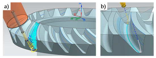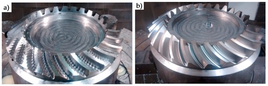 However, the eruption in the market of multitasking or multiprocess machines [6], and the continuous improvement experienced in the area of numerical controls and CAM software, has led to the appearance of a suitable medium for the manufacturing of these complex geometric elements in general purpose machines and with standard tools [7,8]. This type of technology is especially interesting for the manufacture of high module gears (4–12 mm), where it is not so common to find specific gear cutting machines as in the case of lower value modules. The use of standard tools is also an advantage given the reduction in both cost and delivery times, which are parameters of vital importance in production. Special tools for gear manufacturing are also available [9], thus providing flexible alternatives for producing small or medium batches of large bevel gears using a five-axis machine and a disk tool cutting method. This methodology also allows the manufacture of gears of varied geometries, for example, straight gears, helical gears, double helical gear, bevel gears and hypoid gears. The manufacture of gears in multitasking machines [10,11,12,13,14,15,16,17] is seen as an increasingly widespread solution, especially given their high flexibility [18]. Four-axis [19] and 5-axis [20,21] CNC machining can be performed for spiral bevel gears manufacturing. Some of the advantages of this method include an increase in the versatility of the manufacturing process, both in terms of typology and size, allowing the realization of arbitrary modifications of the different gear teeth. Surface quality and the structure of the materials are also important for gear life, as studied in [21]. In order to guarantee the quality of the manufactured components and gear contact [22,23,24,25,26], the machining process of the gear surfaces requires special attention. Surface morphology [27] will determine machining strategies, making it possible to machine gear sculptured surfaces [9], classified as developable ruled surfaces [28], with flank milling strategies [29,30].