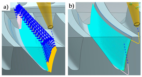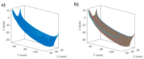 Figure 5. Interdental gap points (a) and trajectories (b) representation.Milling trajectories can be obtained by means of the coordinates of successive tool tip points. Figure 5a shows the tool tip point positions obtained from the machining program of an interdental gap. In Figure 5b, the milling trajectories are represented. In the next steps, milling trajectories are evaluated after the elimination of initial and final noncutting movements, as shown in Figure 6a.
