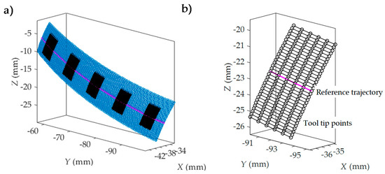 Figure 6. Simulation area (a) and reference trajectory points (b) for the study definition. - Simulation area definition (Figure 6). Secondly, as can be seen in Figure 6a, five simulation areas are defined (in black) in the feed direction. Each of these simulation areas is defined by 6 points in the feed direction and about 30 points in the direction perpendicular to the feed direction. The dimension of the simulation area depends on the programmer’s criteria. The reference trajectory for the study is defined in magenta, corresponding to the one located in the middle of the simulation area. As an example, Figure 6b shows the milling trajectories followed by the tool tip in one of the simulation areas considered in Figure 6a. Black points in each milling trajectory represent the interpolation points given by the machining program for the selected simulation area. Next, the surface topography generated in each simulation area is predicted. In order to achieve this, a local reference system OWXWYWZW is defined for each simulation area (Step 4). First, the positions of the tool center point (C) in the selected simulation area are deduced in Step 3.