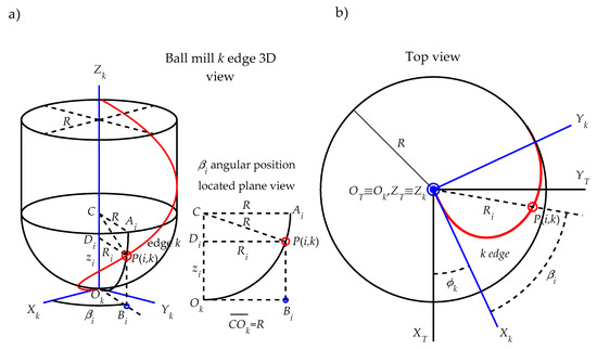 - Tool geometric modelization (Figure 8). The roughness model is developed for a ball end mill geometry, whose behavior resembles that of a conical tool that only cuts with the spherical area of the tool tip for gear teeth finishing trajectories. Figure 8a shows schematically the 3D geometry of a ball end mill of radius R and helix angle i0. For simplicity, only one of the edges is represented in the figure (Figure 8b), but the developed model is generalized for a Nt edge mill. It is assumed that the cutting edge represented in this figure represents one of the edges of the milling cutter, which is referred to as a k edge, where k = 1, 2, ..., Nt. To define the position of a point located on the edge k, a reference system OTXTYTZT attached to the ball end mill is defined: