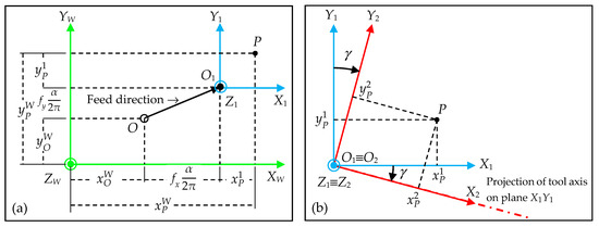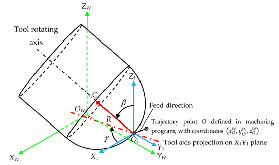 In order to obtain the equations expressing the trajectory of cutting edge points in the local system OWXWYWZW from their coordinates in the tool system OTXTYTZT, three auxiliary systems O1X1Y1Z1, O2X2Y2Z2 and O3X3Y3Z3, shown in Figure 10, are defined as a function of: