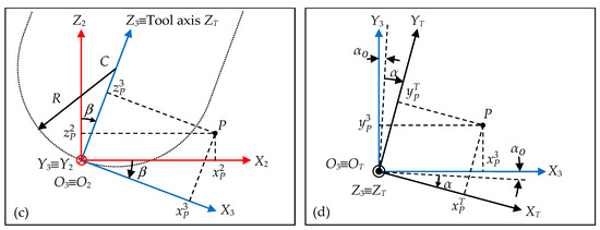 - The rotation angle α (Figure 10d). The tool system OTXTYTZT is rotated by an angle α about axis Z3 in clockwise direction. The homogeneous transformation matrix T3T(α) of this rotation about Z3-axis is:where αO is the tool rotation angle when the tool tip point is located at point O.
