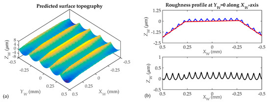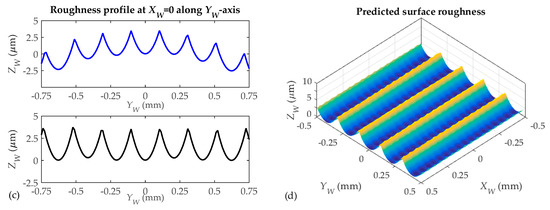 - Surface topographies determination (Figure 11). The surface topography in the gear teeth is obtained from successive point positions of cutting edge points located on the Nt edges with the tool rotating movement. The surface topography is simulated in a rectangular area defined along axes XW and YW, as shown in Figure 7e. This area is divided into a discrete number of planes perpendicular to axes XW and YW. For each plane, taking into account the trajectories of cutting edge points given by Equation (33), the model predicts the area swept by the tool cutting edges during the tool rotation and feed motion. The profile generated at each plane is obtained from the lowest positions of marks left by cutting edge points. By considering the profiles generated in those planes, the 3D surface topography in the rectangular area can be predicted. This allows the profiles generated along axes XW and YW to be analyzed. As an example, Figure 11 shows the surface topography predicted for the simulation area selected in Figure 6b. In Figure 11a, a 3D representation of the predicted surface topography is shown. When the 2D profiles generated at two planes (YW = 0 and XW = 0) are considered (Figure 11b,c), it can be observed that profiles are not only composed of roughness marks left by tool cutting edges. In Figure 11b, the straight sections defining the tool trajectory (red line) can be observed. In Figure 11c, the form of the gear tooth surface can also be observed. In order to analyze the surface roughness, the effect of tool trajectory in each milling pass is removed for each profile predicted along YW-axis. As a consequence, roughness profiles (in black) are obtained. In Figure 11c, the form of the gear surface is also removed from the predicted profile and the roughness profile in black is obtained. In Figure 11d, the predicted surface roughness without the influence of the milling trajectory is shown. It can be observed that the step over between milling passes has a significant influence on the topography and the roughness peak-to-valley values. However, for this case, the effect of tool feed on roughness is less.