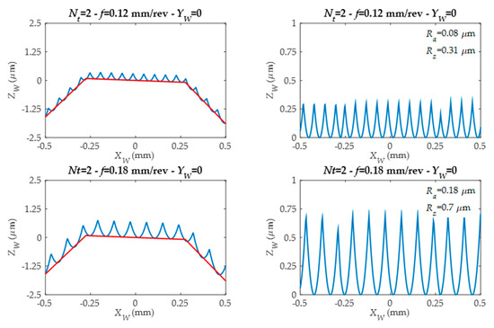 In the left-side figures (Figure 12 and Figure 13), the straight sections defined by machining G1 (linear movement) are represented by a red line. The blue color represents the roughness profile. As can be seen, the roughness profile depends on the tool edge number (Nt) and programmed tool feed value (f). In the right-side figures (Figure 12 and Figure 13), the form associated to workpiece component is eliminated, and for each roughness profile, both the arithmetic mean roughness parameter (Ra) and the average roughness parameter (Rz) are obtained.