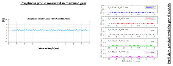 Figure 14 shows a comparison, for the same gear tooth, between the profile generated after gear measurement (after the machining process) and the profile generated by the developed roughness predictive model. The variations shown in some roughness profiles peaks correspond to the trajectory when interpolating between the different interpolation points that make up the same machining path.