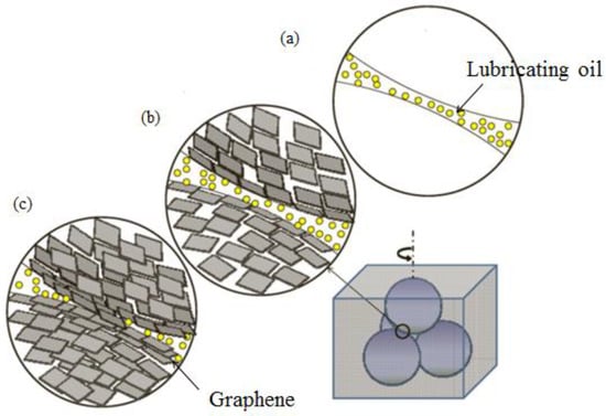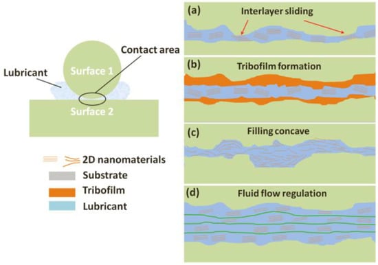 - Self-healing mechanism. Two-dimensional materials can fill a concave area on a friction surface to smoothen it (Figure 1). Gulzar et al. [44] investigated the self-healing effect of nanomaterials. Nanoparticles deposit on interacting surfaces and compensate for the mass lost, thereby reducing wear and tear.