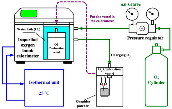 The HPCM manufacturing system of MNCBMs proposed in this study is shown in Figure 1. The main body of the system is an isoperibol oxygen bomb calorimeter (6200EA, PARR, Moline, IL, USA) with an external oxygen cylinder, oxygen pressure regulator, isothermal unit, and oxygen combustion vessel (oxygen bomb). Graphite powder (GP; average size = 3.2 μm) was exploded in the isoperibol oxygen bomb calorimeter by applying various oxygen pressures to the oxygen bomb, namely 0.5, 1.0, 1.5, 2.0, 2.5, and 3.0 MPa, all of which are below the recommended pressure (30 atm) for calorimetry. These oxygen pressure settings were chosen to avoid the complete combustion of the GP, which would result in an insufficient MNCBM production rate [26]. The MNCBMs had varying morphologies and were composed of various materials because of various oxygen pressures to produce different explosive energies in oxygen bomb. First, 1.0 g of GP was placed in the oxygen bomb’s sample pan, which was subsequently subjected to various oxygen pressure levels through a standard combustion calorie measurement procedure to produce MNCBMs. Lastly, the combustion residue was weighed using an electronic balance (GR200, A&D, Tokyo, Japan), and the weight ratio of the residual weight after combustion to the initial weight of the GP was defined as the production rate (PR). For the isoperibol oxygen bomb calorimeter, we only need to input the weight of the sample and the ignition thread, and then it automatically calculated and recorded the total combustion heat value (Hcv) of the sample under each experimental parameter through a standard combustion calorie measurement procedure. Since the sample was burned in a fixed volume chamber, the total combustion heat released by burning the sample and the sample’s moisture was automatically calculated by measuring the temperature change of the water bath. Therefore, Hcv belongs to the higher heating value.