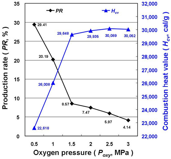 PR and combustion heat value (Hcv) of the micro/nanocarbon-based materials (MNCBMs) for HPCM at various oxygen pressures.
