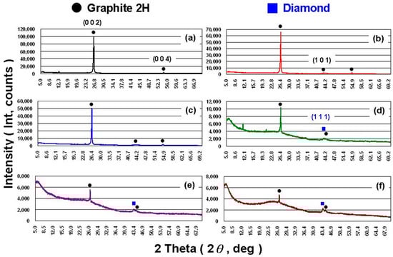 Figure 4 shows the X-ray diffraction (XRD; D8 Advanced, Bruker, Rheinstetten, Germany) patterns for the MNCBMs produced at various oxygen pressures. In terms of the XRD patterns, the MNCBMs crystallized at oxygen pressures under 0.5 and 1.0 MPa exhibited no obvious differences from the original GP (Figure 4a). The XRD patterns showed that the (0 0 2) diffraction peak was located at 2θ = 26.5°, indicating that the principal material of the MNCBMs was crystalline graphite (graphite 2H, PDF # 893439) [27]. A clear difference was observed between the materials of the MNCBMs and GP when the oxygen pressure was increased to 1.5 MPa or higher. The intensity of the (0 0 2) diffraction peak decreased as the oxygen pressure increased, and the intensity of the (1 1 1) diffraction peak increased as the oxygen pressure increased. The (1 1 1) diffraction peak was located at 2θ = 43.9°, indicating that the MNCBMs contained a diamond (PDF # 898499) [27]. The (1 1 1) diffraction peak was not sharp, and the diffraction peak intensity was not high; therefore, it was likely a diamond with poor crystallinity. In addition, overall, the diffraction patterns indicated that a part of the crystalline graphite had been converted to amorphous carbon when the oxygen pressure exceeded 1.5 MPa. Thus, the MNCBM produced when the oxygen pressure exceeded 1.5 MPa mostly comprised crystalline graphite (graphite 2H), amorphous graphite, and a small amount of defective diamond.