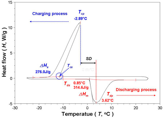 A phase-change experiment was conducted using a DSC (DSC; Q20, TA, New Castle, DE, USA) with a mechanical refrigeration system (RCS40, TA, New Castle, DE, USA) in a high-purity nitrogen (5 N) atmosphere. The temperature and calorimetric accuracy of the DSC were ±0.1 °C and ±1.0%, respectively. The experimental temperature range was –25–25 °C, and the heating and cooling rates were both set at 5 °C/min. Figure 6 shows the charging and discharging curve of the DSC for water. The phase-change peak temperature was the solidification temperature (Tcp) and melting temperature (Tdp) in the charging and discharging processes, respectively. The Tcp during the charging process is higher than the starting temperature (Tcs), which means that subcooling (or supercooled) occurs. The difference between Tdp and Tcp was defined as the SD of the sample [19,33,34]. The area of the charging and discharging peaks was calculated using DSC test software (Universal Analysis 2000, TA, New Castle, DE, USA) to obtain the phase-change heat for solidification (ΔHs) and for melting (ΔHm). For each test sample, the aforementioned fundamental characteristic and phase-change experiments were conducted five times. The obtained data were then averaged to obtain the final test results for all samples.