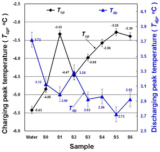 Figure 7 shows the Tcp and Tdp of each sample in the DSC experiment. Tcp and Tdp respectively represent the solidification (freezing) and melting temperatures in the DSC experiment. SDBS addition to water increased the Tcp of water, and GP and MNCBM addition to the SDBS aqueous solution further enhanced the Tcp of water. Compared with water, the Tcp of the S5 showed the largest increase (2.15 °C). SDBS, GP, and MNCBM addition to water reduced its Tdp. Compared with water, the Tdp of the S5 exhibited the largest decline (1 °C). A PCM has higher Tcp, which enables the charging process to occur at higher temperatures. Thus, the larger temperature difference between the PCM and the coolant of the chiller can be used for solidification phase-change to enhance heat transfer and shorten ice-storage time, thereby increasing charging process efficiency. The PCM with lower Tdp had a larger temperature difference between PCM and air-conditioning load, and this enhanced heat-transfer efficiency in response to large air-conditioning load changes.