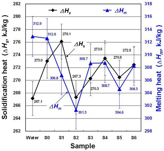 Changes in heat for solidification (ΔHs) and melting (ΔHm) for the samples.