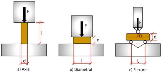 Quasi-static mechanical compression tests were used to ascertain the mechanical strength of the pellets for low strain rates. The biomass pellet diameters and lengths were measured according to BS EN ISO 17829:2015 [], and conformed with the requirements of BS EN ISO 17225-2/6 [,]. The biomass pellet diameters were 8.4 ± 0.2 mm for mixed wood pellets, 8.4 ± 0.1 mm for eucalyptus pellets, 8.6 ± 0.4 mm for sunflower pellets, 6.3 ± 0.2 mm for miscanthus pellets, 5.9 ± 0.1 mm for steam exploded pellets, and 5.8 ± 0.1 mm for microwave pellets. The biomass pellet lengths were 21.1 ± 7.0 mm for mixed wood pellets, 17.4 ± 4.8 mm for eucalyptus pellets, 14.2 ± 4.3 mm for sunflower pellets, 19.7 ± 4.8 mm for miscanthus pellets, 18.2 ± 5.6 mm for steam exploded pellets, and 22.8 ± 5.5 mm for microwave pellets. For the three-point bend test, samples with a length greater than the span, L (10.2 mm), were used. The pellets were tested in three orientations; axial, diametral, and flexure (Figure 1), on an Instron Mechanical 5969 testing system (Norwood, MA, USA). The strain rate was 1 mm/min with a 5 kN load cell for all tests, and the samples were tested in a similar approach to that adopted by Graham et al. [,]. For the axial tests, the ends of each pellet were first ground square using a bench grinder or sand paper. For the diametral compression tests, the pellets were placed on their sides and compressed laterally, while a three-point loading rig was used for the flexure tests. Ten pellets of each sample were tested in each orientation.