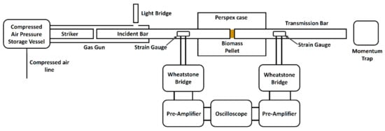 The dynamic mechanical strength of a material is a measure of its strength at high strain rates (102–104 s−1) []. The tests aim to determine the material properties under hammer-blowing conditions, which are similar to those experienced with comminution systems []. A controlled method of analysing these mechanical properties is through a Spilt Hopkinson pressure bar (SHPB) []. The SHPB test has been used to analyse the forces within mills [], and analyse the strength of cellulosic materials []. Ultrafast load cells (UFLC) have been used to analyse the fracture of single particles under impact loading [,], but these tests involve point loads rather than uniformly distributed loads. To date, the dynamic mechanical strength of biomass pellets has yet to be explored in literature. This paper presents an assessment of pellet durability, quasi-static mechanical strength, and a novel analysis of the dynamic mechanical strength of several varieties of biomass pellets. The paper establishes potential correlations between mechanical properties and milling energies and evaluates the appropriateness of the tests for characterising biomass pellets during storage, transport, and comminution.