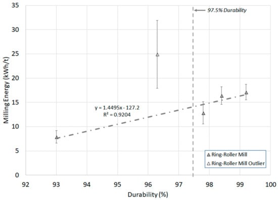 Ring-roller mill energy versus pellet durability. The acceptable limits of durability according to BS EN ISO 17225-2/6 for wood and non-wood pellets are noted. (Milling n = 3, durability n = 2).