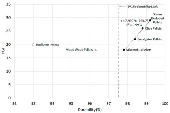 Pellet Hardgrove Grindability Index (HGI) values versus pellet durability. The acceptable limits of durability according to BS EN ISO 17225-2/6 for wood and non-wood pellets are noted (n = 2).
