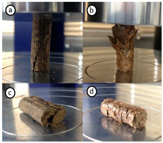 (a) Axial failure by shear (sunflower pellets), (b) axial failure by delamination (mixed wood pellets), (c) diametral failure by shear (sunflower pellets), and (d) diametral failure by delamination (mixed wood pellets).