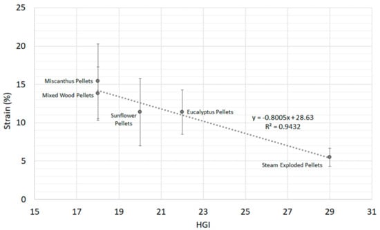 In order to evaluate any potential relationships between the quasi-static mechanical properties of the biomass pellets and their previously obtained milling energies [], correlations were explored for all parameters using Minitab 17.1. Only correlations with p-values below 0.05 were considered statistically significant. Based on this, no correlations were observed for axial or flexure mechanical properties and milling energy. However, several correlations were observed for diametral compressive mechanical properties. The first correlation was between biomass strain and HGI (Figure 6). With a p-value of 0.006, the relationship was statistically significant. The correlation between diametral compressive ductility (strain at failure) versus HGI (Figure 6) shows a strong negative correlation (−0.97) with no unusual residuals, and a strong data fit (R2 > 0.94). A similar but weaker correlation was also observed between diametral compressive elastic strain and HGI (R2 > 0.82), and is shown in Supplementary Figure S2. The results suggest that ductility relates better to HGI for all pellet types than durability does, which only showed a correlation for samples with a durability above 97.5% (Figure 4).