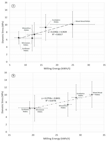 Figure 7 shows that correlations also exist between milling energy in a ring-roller mill (Figure 7a) and knife mill (Figure 7b) against diametral ultimate stress for the biomass pellets. Similar correlations were obtained for the milling energy and diametral proportional stress for the pellets (Supplementary Figure S3). For both correlations, the steam exploded pellets were an extreme outlier, with much higher diametral stress values than the other pellets, and thus are not indicated in Figure 7. Steam explosion uses the introduction and release of high-pressure steam in a reactor in short periods of time to rapidly expand biomass material. This induces significant physical, chemical, and structural changes in the biomass, as well as makes lignin more available for binding during densification []. Steam explosion breaks the lignin down into moderately reactive low-molecular weight products while retaining their basic structure. In contrast, torrefaction is the slow heating of biomass in an inert environment up to a maximum temperature of 300 °C []. Torrefaction improves binding during densification by increasing the number of available lignin sites, breaking down the hemi-cellulose matrix, and forming fatty unsaturated structures. The results of this study indicate that the steam explosion process has fundamentally altered the nature of the biomass pellet structure compared with other non-thermally treated pellets and microwave pellets. This indicates that different torrefaction methods impact pellet strength differently because of the varying impact of the thermal pre-treatment process on the composition of the pellets.