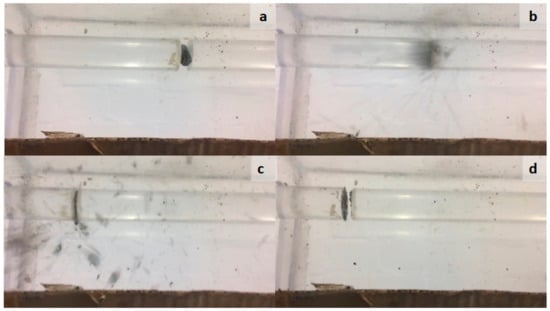 Quasi-static mechanical tests give the mechanical response of biomass pellets at low strain rates (10−4–100 s−1) []. However, the actual strain rates experienced during milling are significantly higher. The Split Hopkinson pressure bar (SHPB) test provides a method of measuring the dynamic response of biomass pellets at high strain rates. Using a high speed camera (iPhone 5s, 120 frames per second), the dynamic response of a mixed wood pellets in the diametral orientation was recorded (Figure 8). Initially, the pellet was suspended between the incident and transmission bars (Figure 8a). Subsequently, the incident bar was hit by the striker and compressed the specimen into the transmission bar (Figure 8b). Both bars and the specimen travel horizontally until the transmission bar hits the stop and reverses direction, and then collides with the incident bar (Figure 8c). The energy transfer causes the transmission bar to accelerate away from the bar, resulting in the specimen material being released in an explosion-like manner. At the end of the test (Figure 8d), the pellet has completely disintegrated, and a small amount of pellet has been deposited on the contact faces of the bars.