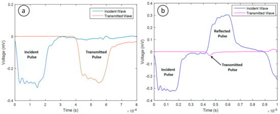 The impact results in a signal being recorded by the strain gauges on the incident and transmission bars. Figure 9a shows that for the no sample condition, virtually all the impact energy is transferred to the transmission bar upon impact. However, when a biomass pellet is placed between the two acrylic bars, the energy transferred is significantly reduced (Figure 9b). When the compression wave in the incident bar propagates to the interface between the incident bar and specimen, part of the wave is reflected back, and the rest is transmitted into the specimen. The wave is then reflected back and forth within the sample because of the mismatch of the wave impedance between the sample and bars.