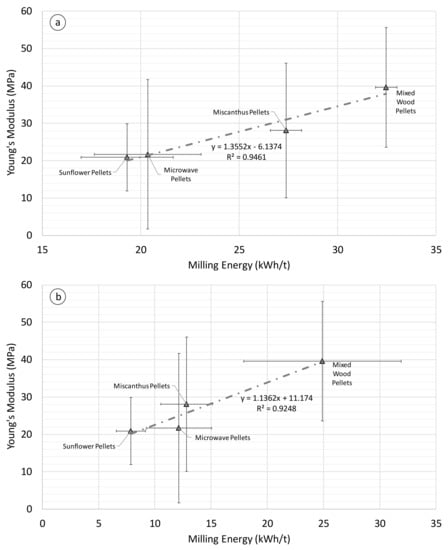 Correlations were obtained between the dynamic axial Young’s modulus and ring-roller and knife milling energies. For axial dynamic Young’s modulus and ring-roller milling energy (Figure 10a), the positive correlation (0.96) was statistically significant (p = 0.038) with a good fit (R2 > 0.92). The correlation was slightly stronger for axial dynamic Young’s modulus and knife milling energy (Figure 10b), with a positive correlation (0.97) and a p-value of 0.027, and a good data fit (R2 > 0.94). However, as Figure 10 illustrates, there is a large degree of uncertainty to the dynamic strength results. The poor repeatability of single pellet mechanical tests has been noted in previous studies [], and thus further work is required to enhance the accuracy of the results through refined testing methodologies, such as the influence on pellet length and diameter on pellet strength. Despite this, the results indicate that correlations can be drawn between milling energy and dynamic strength tests.