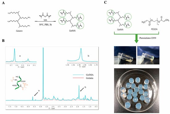 (A) Synthesis mechanism of GelMA; (B) the 1HNMR spectra of the GelMA (a, δ = 5.4 and 5.6 ppm; b, δ = 1.87 ppm); peaks at 5.4 ppm and 5.6 ppm correspond to two H methacrylic double bonds, while the peak at 1.87 ppm corresponds to the methyl group of methacrylic acid; (C) GelMA/PEGDA solution before and after 5 min UV treatment.