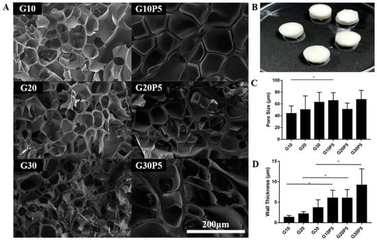 Although the interior structure of hydrogel maybe different from the natural state before lyophilization, it is still a useful method for investigating the interior 3D structure of hydrogel. Figure 2A shows the GelMA hydrogel and GelMA/PEGDA hydrogel cross-section images as comparison. The pore diameter (Figure 2C) of G10 was 43.79 ± 12.89 μm, and G10P5 was 65.56 ± 13.45 μm, which was significantly larger than G10 (p < 0.05). The pore diameter sof G20 and G30 were similar to G20P5 and G30P5; they showed no significant change. The PEGDA reacted with GelMA in the system and significantly increased the pore diameter that was very suitable for human cell growth in guide bone regeneration application. As shown in Figure 2D, the thickness of pore wall from G10 to G30P5 was 1.33 ± 0.42, 2.15 ± 0.54, 3.68 ± 1.92, 6.02 ± 1.93, 6.00 ± 2.11, and 9.17 ± 3.98, respectively. The wall thickness of hydrogel was significantly increased (p < 0.05) when PEGDA was added into reaction system, which enabled the hydrogel with better mechanical properties. In addition, an increase of wall thickness can lead to a decrease of pore density, which results in an increase of average pore diameter per unit volume, as shown in Figure 2A.