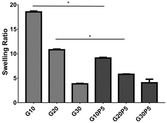 Swelling ratio of hydrogel was an essential factor for tissue engineering application. The swelling ratios of GelMA and GelMA/PEGDA hydrogel were calculated as shown in Figure 3. The swelling ratios of G10, G20, G30, G10P5, G20P5, and G30P5 were 18.33 ± 0.19, 10.81 ± 0.15, 3.83 ± 0.11, 9.11 ± 0.14; 5.79 ± 0.07, and 4.06 ± 0.74, respectively. The swelling ratio of hydrogel decreased significantly (p < 0.05) with the amount of PEGDA added. This was because the PEGDA could increase the degree of crosslinking. The high crosslinking degree improved the stiffness of hydrogel and led to low swelling ratio [1,26], which made the hydrogel suitable for implanted material at low wound pressure.