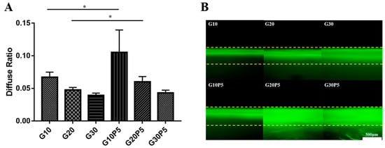As shown in the Figure 4A, PEGDA could react with GelMA and increase the water diffusivity of hydrogel as compared to the hydrogel without PEGDA. The D values of G10, G20, G30, G10P5, G20P5, and G30P5 were 6.71 ± 0.78 (×10−2), 4.76 ± 0.38 (×10−2), 3.93 ± 0.36 (×10−2), 10.54 ± 3.43 (×10−2), 6.00 ± 0.82 (×10−2), and 4.32 ± 0.41 (×10−2), respectively. According to these data, the diffusion resistance of G10P5 and G20P5 was reduced significantly (p < 0.05) compared with G10 and G20, when PEGDA was added into reaction system. However, there was no significant difference between G30 and G30P5, and this may be caused by the similar pore diameter of G30 and G30P5.