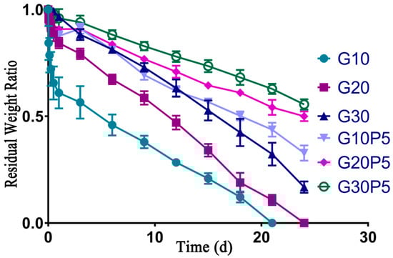 The degradation rate of hydrogel in PBS solution without collagenase was very slow, and especially the GelMA/PEGDA hydrogel was nearly non-degradable. The Figure 5 shows the biodegradation results of GelMA and GelMA/PEGDA hydrogel. All the hydrogels were soaked in PBS for 24 h to fully swell and remove the residues before test. The G10 and G20 were totally degraded after 4 weeks; however, the hydrogel with PEGDA could maintain its shape, and the residual weight ratios of G20P5 and G30P5 were more than 50% after 4 weeks. The hydrogel with PEGDA degraded more slowly than the pure GelMA hydrogel, as the PEGDA improved the crosslinking degree and made the 3D structure of hydrogel more complicated. Thus, the GelMA/PEGDA hydrogel needed long time to degrade in vitro, and this overcame the shortcoming of pure GelMA hydrogel.